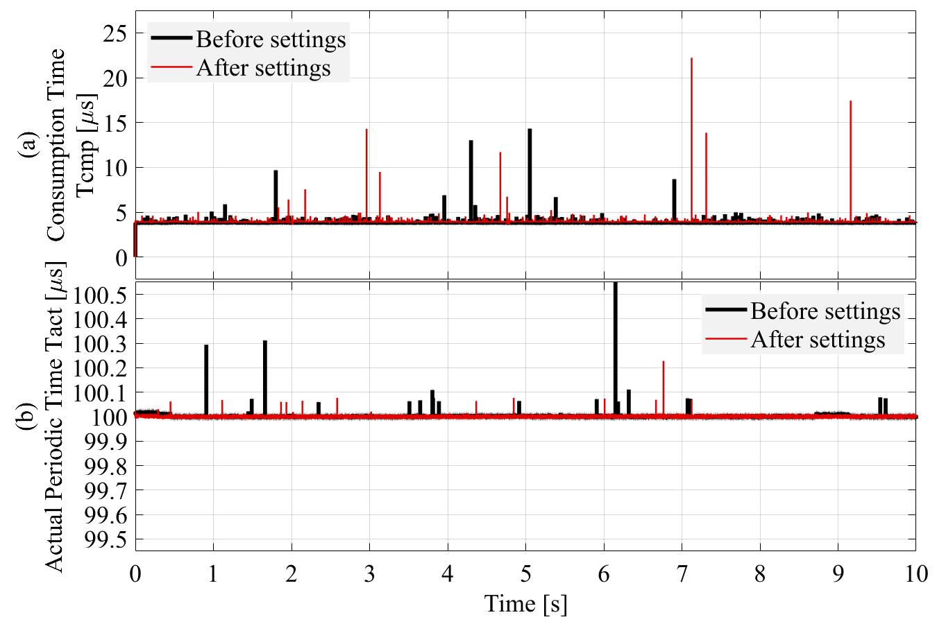 ARCS6におけるリアルタイム性の実測結果(黒:パラメータ設定前、赤:パラメータ設定後)
